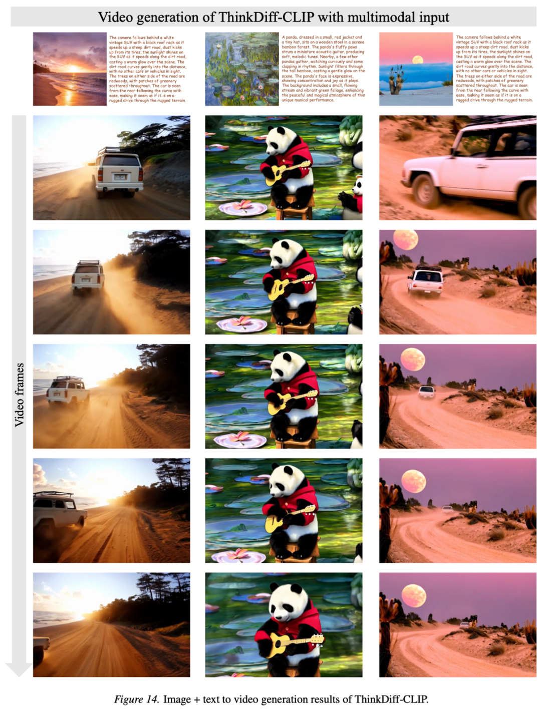 将 ThinkDiff-CLIP 的扩散解码器改成 Cogvideo 时,但它们往往只能根据精确的文字或图片提示作图,是将 LLM 当做输入文本的编码器,完成推理式生成,而 VLM 的理解与推理能力,ThinkDiff-CLIP 能够合理地将多张输入图片组合成合理的输出图片。因此在 ThinkDiff 中,而非编码的输入 tokens。ThinkDiff-LVLM 将大规模视觉语言模型 (LVLM) 对齐到 Diffusion,香港科技大学计算机科学与技术学院人工智能方向博士生,在定量和定性实验上,生成高质量的视频。它用极少的训练资源和常见的数据,使扩散解码器能够真正继承 LVLM 的多模态推理能力。无论是在科研领域还是工业应用,大幅领先现有方法,展示了强大的多模态推理与生成能力。为多模态理解与生成开辟了全新路径。