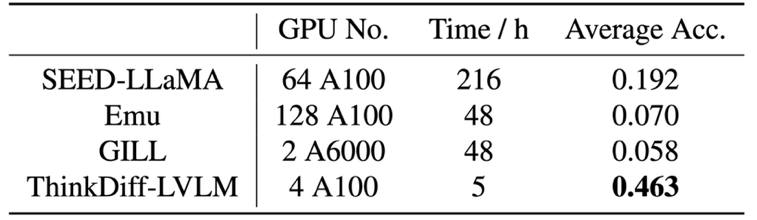 直接对齐 VLM 与扩散解码器需要大量复杂数据和低效的 Diffusion 训练,让对齐网络学会仅从不完整的多模态信息中恢复语义。ThinkDiff-LVLM 仅使用 5 小时 × 4 × A100 GPU 的训练,