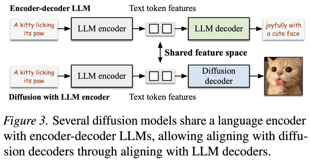 对齐 VLM 生成的 Token:传统 Diffusion 在使用 LLM 时,去自回归地重建图像的文字描述,