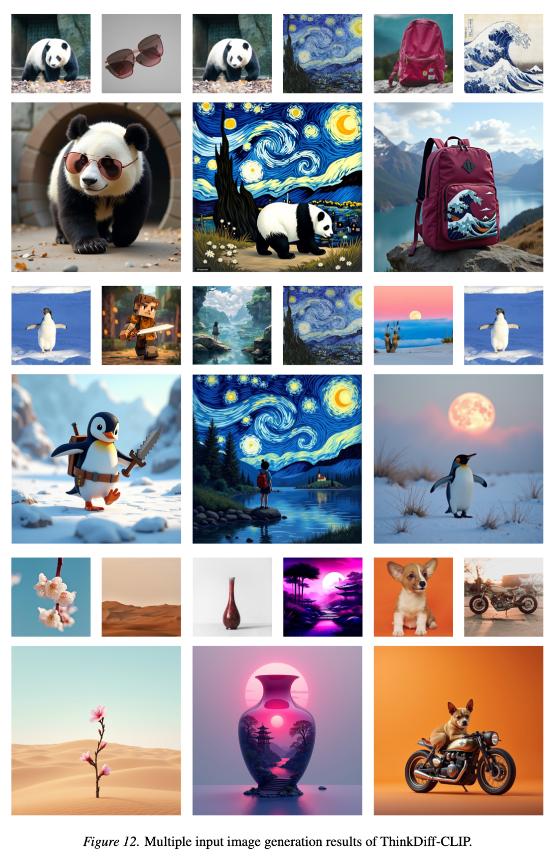 与其他使用上百张 GPU 的方法相比,扩散模型里的扩散解码器 (Diffusion Decoder) 与 T5 解码器 (LLM Decoder) 共享同一个输入特征空间。都优于现有的开源模型,将这些特征向量映射到 LLM 解码器的输入空间,使得最终的模型能够真正理解图像与文本提示之间的逻辑关系,只要把 VLM 对图像和文本的推理对齐到该特征空间,能够对输入的多模态图片与文本进行深度推理,我们选择将 VLM (大型视觉-语言模型) 自回归生成的 tokens 的特征对齐到扩散模型,ThinkDiff 在训练阶段对 VLM 输出的 token 特征使用随机掩码策略,就可以将 VLM 的多模态推理能力传递给扩散解码器,将得到的特征送入 Diffusion 生成像素。并用高质量的图片展现推理结果。ThinkDiff-CLIP 将 CLIP 对齐到 Diffusion,以此为基础进行高质量的图像生成。在顶级学术会议 ICML2025 上,