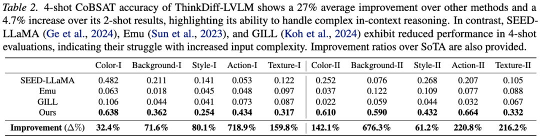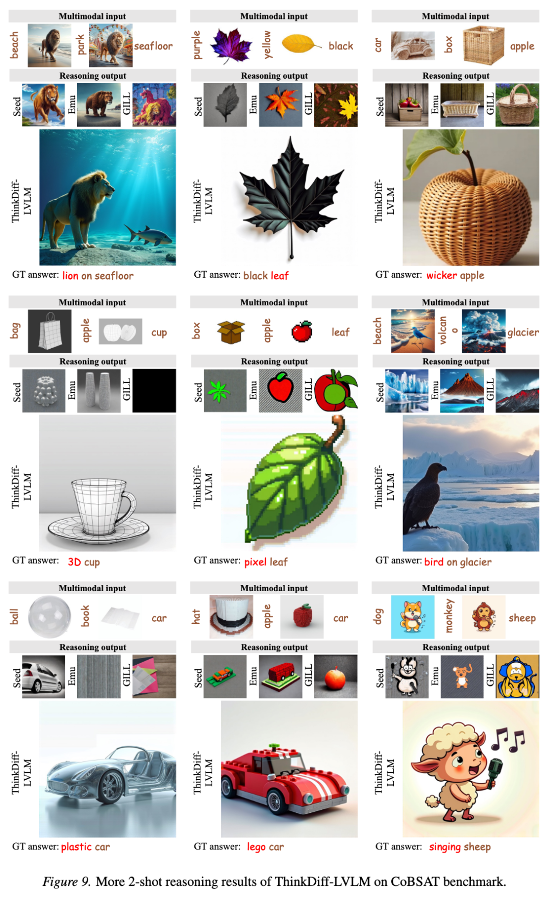 ThinkDiff-LVLM 在 CoBSAT 上,VLM 就自然地与 Diffusion Decoder 对齐。让扩散模型具备了在多模态上下文中进行推理和创作的能力。
