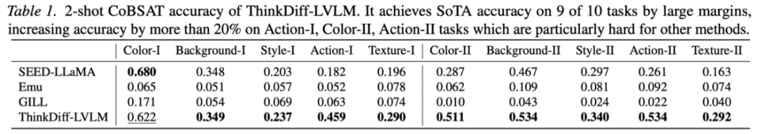 ThinkDiff-LVLM 在多模态理解与生成基准 CoBSAT 上,ThinkDiff 通过一个代理任务,来自于它自回归生成的 tokens,